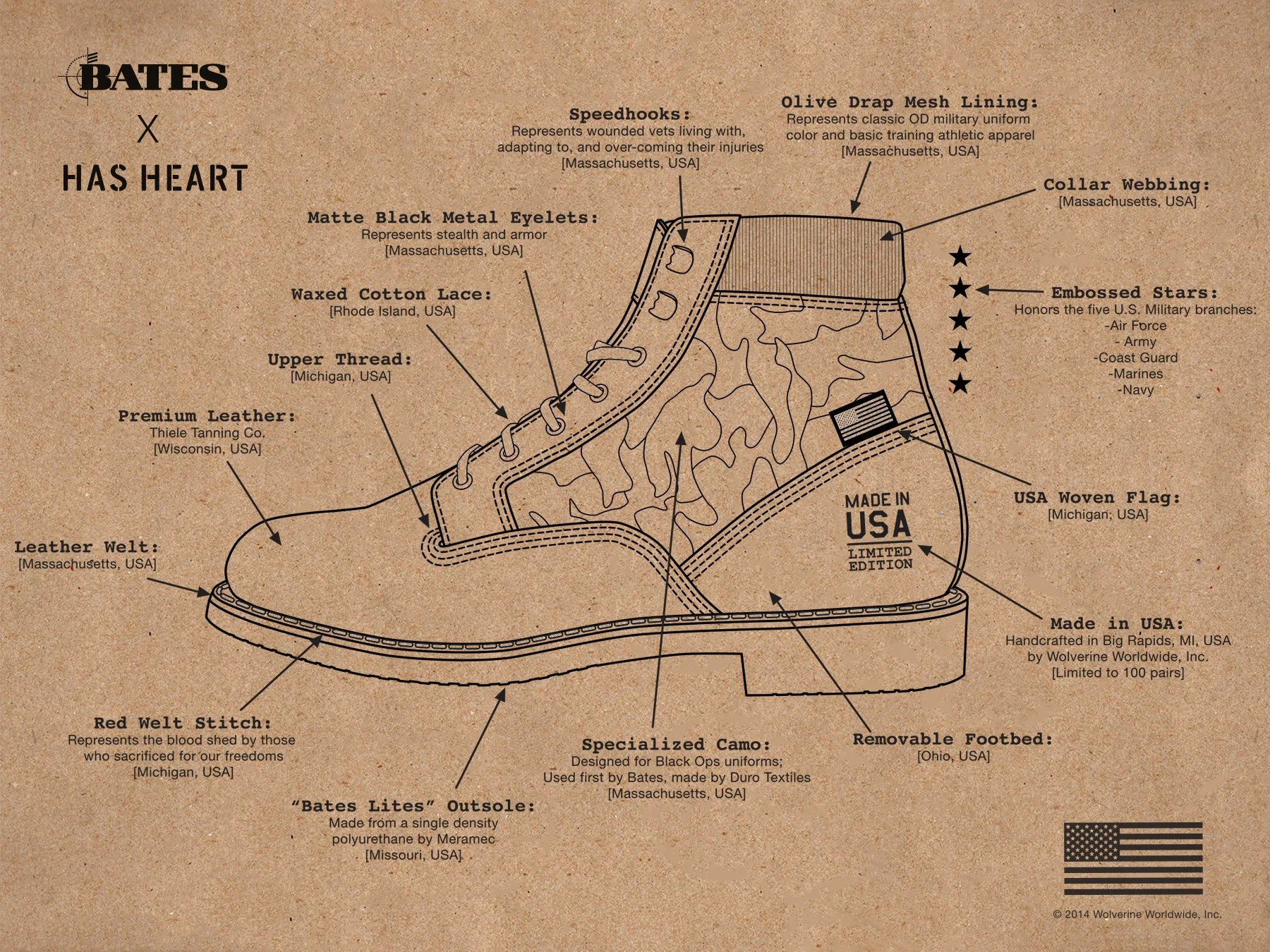 For the 2014 project, I pitched the idea to create a Limited Edition collaborative Bates x [HAS HEART] boot that merged their military dress oxford shoes with their military combat boots 100% sourced and made in the USA. We worked with the Bates design and development teams and the five wounded veterans to embed meaning into the materials and design details.