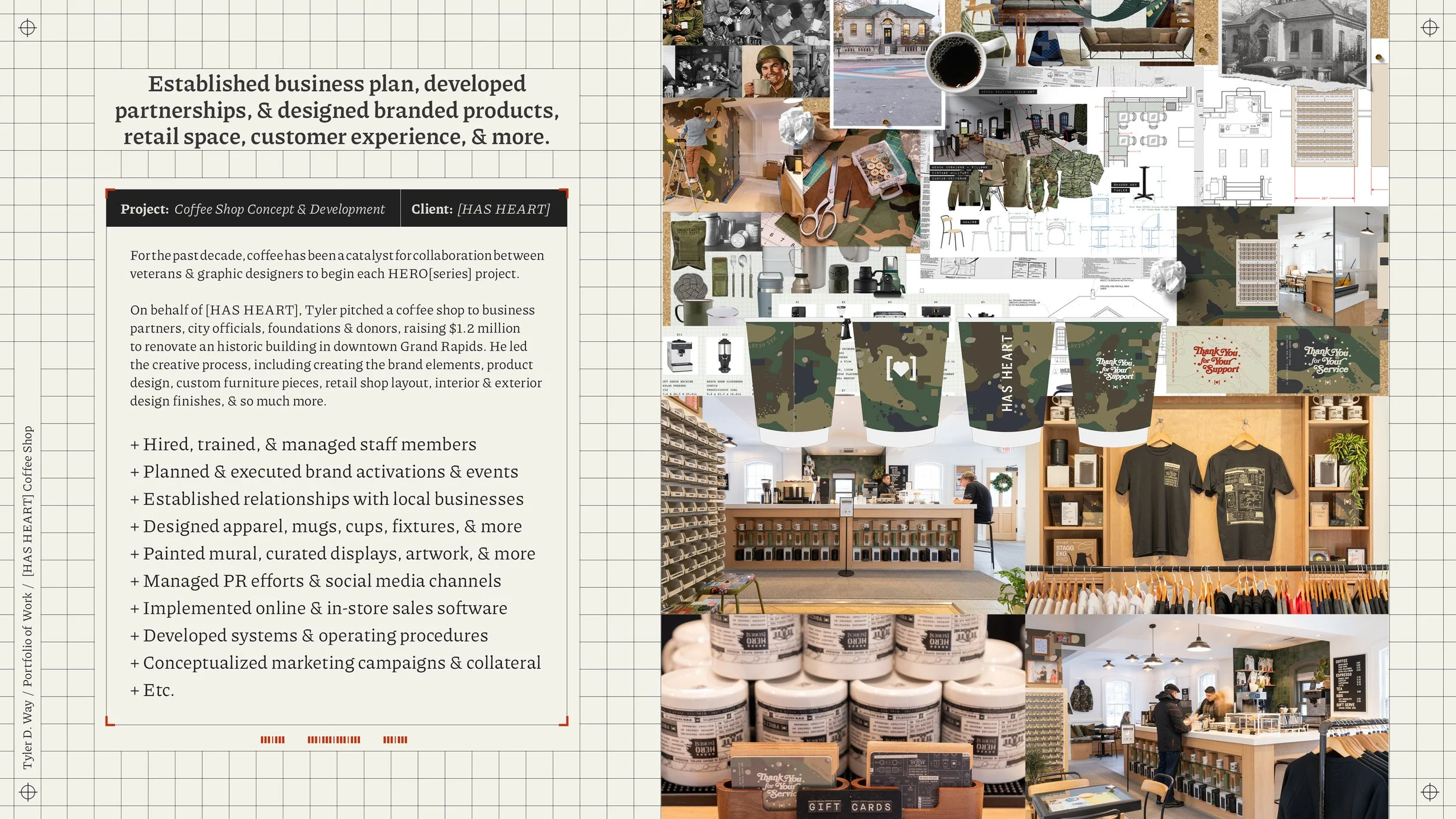 Tyler helped [HAS HEART] pitch a coffee shop to business partners, city officials, foundations & donors to raise $1.2 million to enable the NPO to serve the Grand Rapids community for decades. Tyler led the creative process, including brand elements, product design, & worked with the architecture firm on the store layout, interior & exterior design.