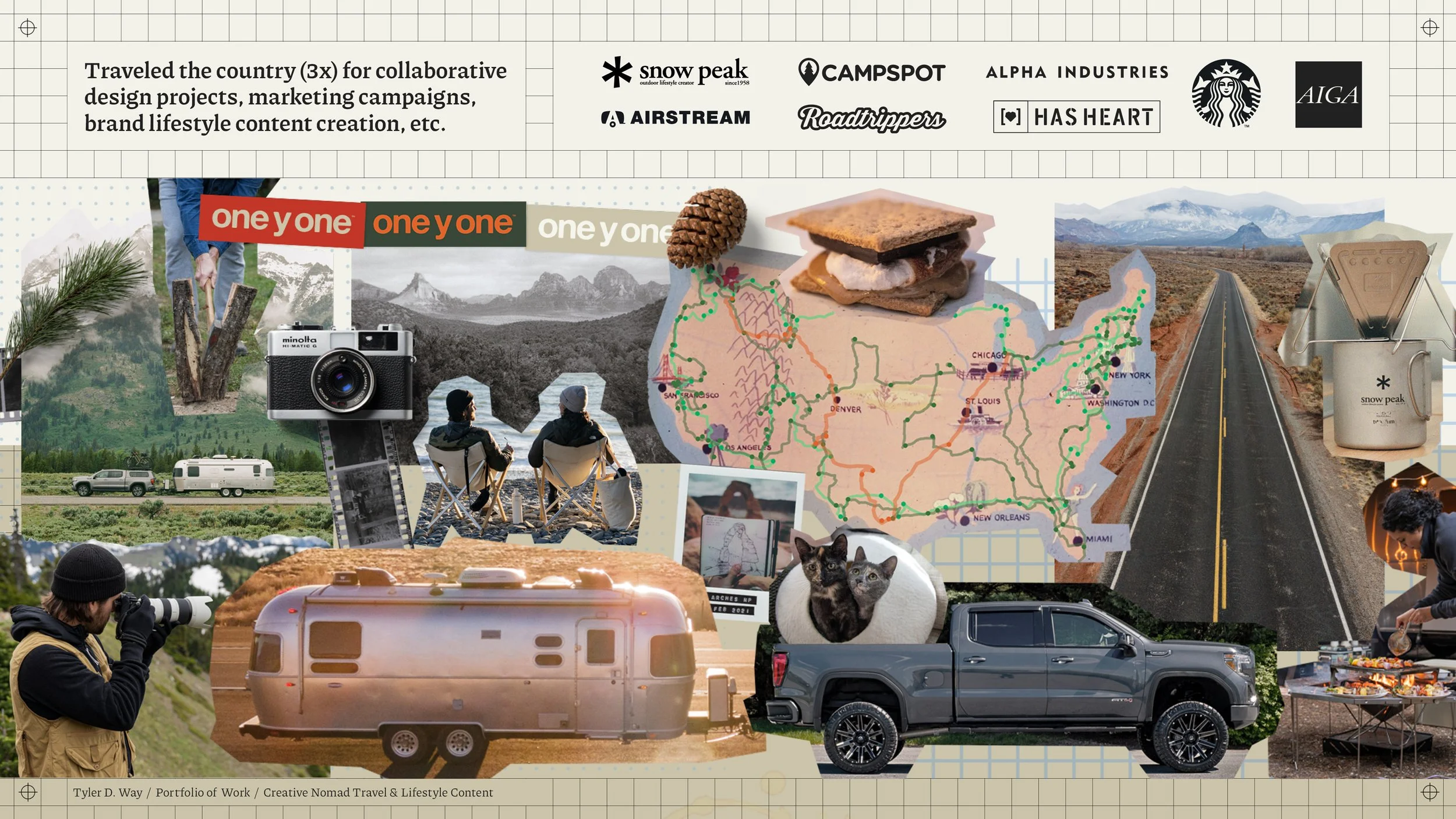 Tyler and his wife/partner Kendra evolved their creative agency to travel where the work is, which enabled them to travel the country 3-times for a variety of collaborative design projects, marketing campaigns, brand content creation, and more.