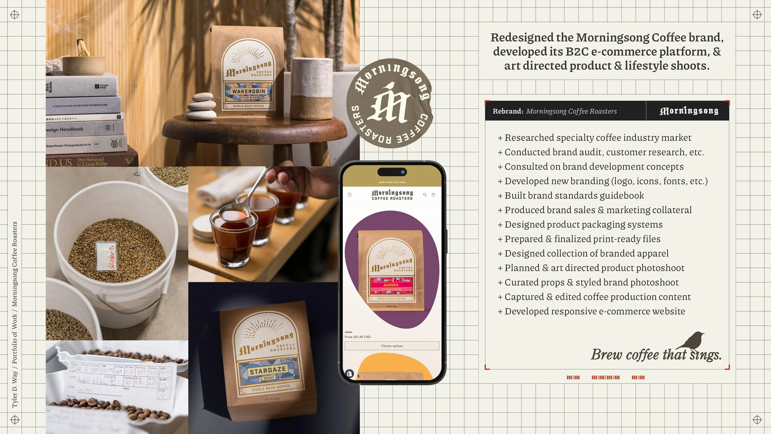 Following months of market research, brand analysis, and design exploration, Tyler developed the Morningsong Coffee Roasters brand identity and a robust packaging design system that is flexible enough to distinguish the tasting note profiles of different coffees, ranging from limited-edition single-origin to seasonal mainstays.