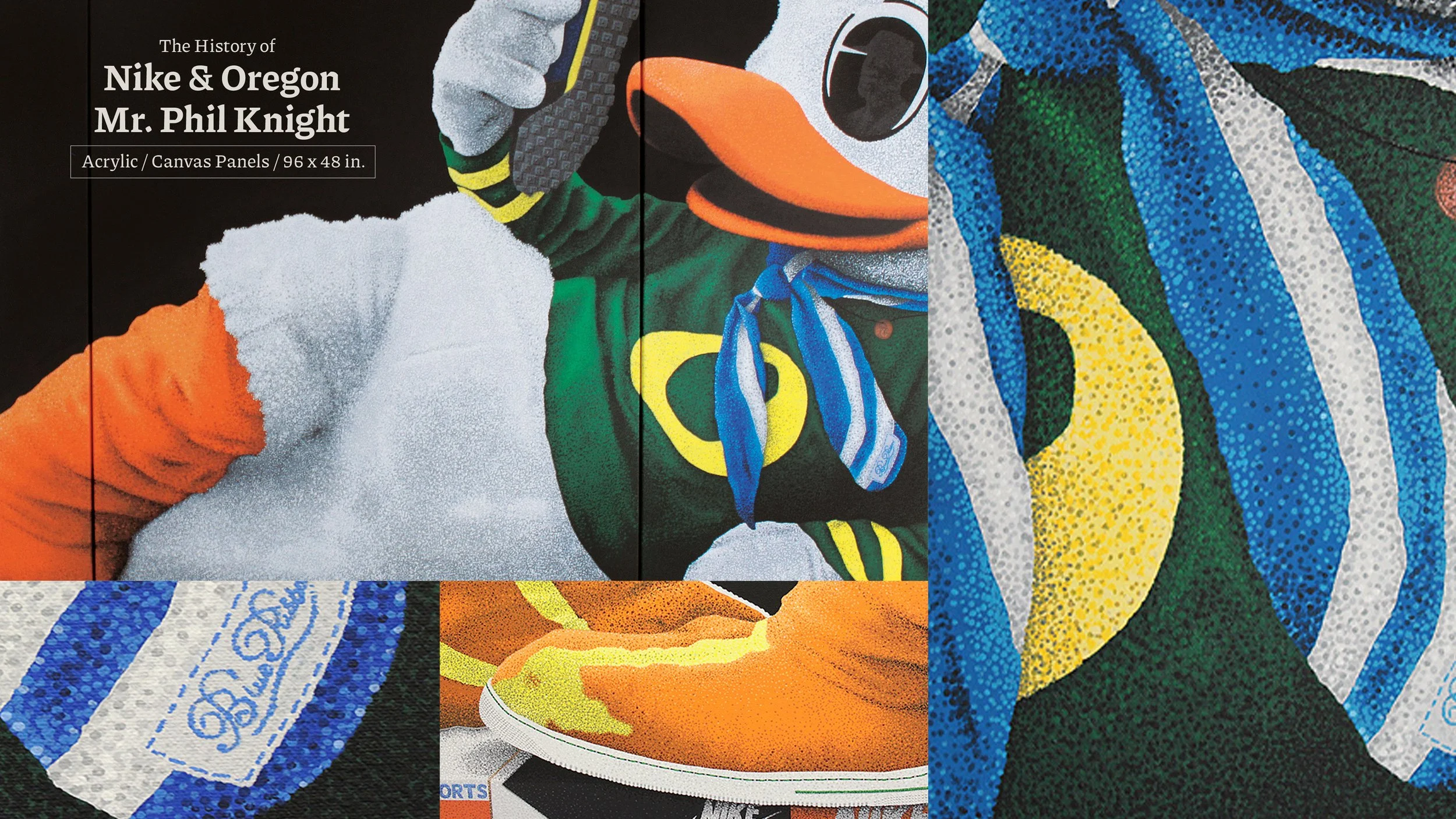 Tyler painted a 96 x 48in. pointillism painting for Nike founder, Phil Knight. The three-panel piece subtly featured the history of Nike, including its origins at the University of Oregon.