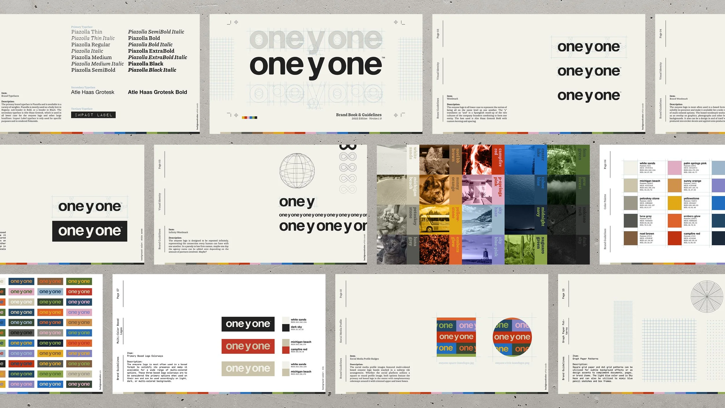 The final brand identity system included a custom color palette pulled directly from photographs from oneyone travel experiences, along with personal stories inspired by loved ones. These colors were combined to create a variety of boxed logo colorways to be utilized in multi-colored rows, flashing GIFs, decal packs & more.