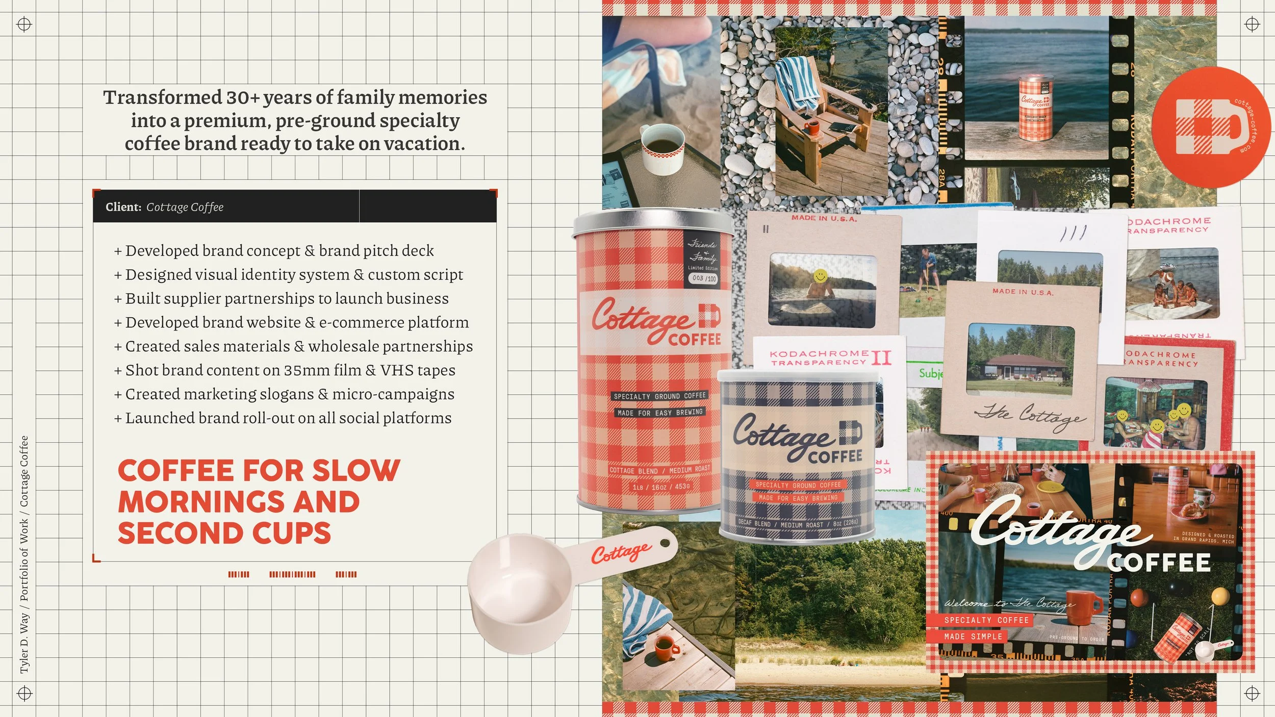 Within a two-month timeframe, Tyler developed a business concept, built a brand identity system, generated digital assets utilizing family archives, developed a coffee partnership and distribution process, designed product packaging, established a wholesale sales strategy, shot and edited 35mm film and VHS camcorder footage, developed the e-commerce website, and launched the brand throughout all major social media channels.