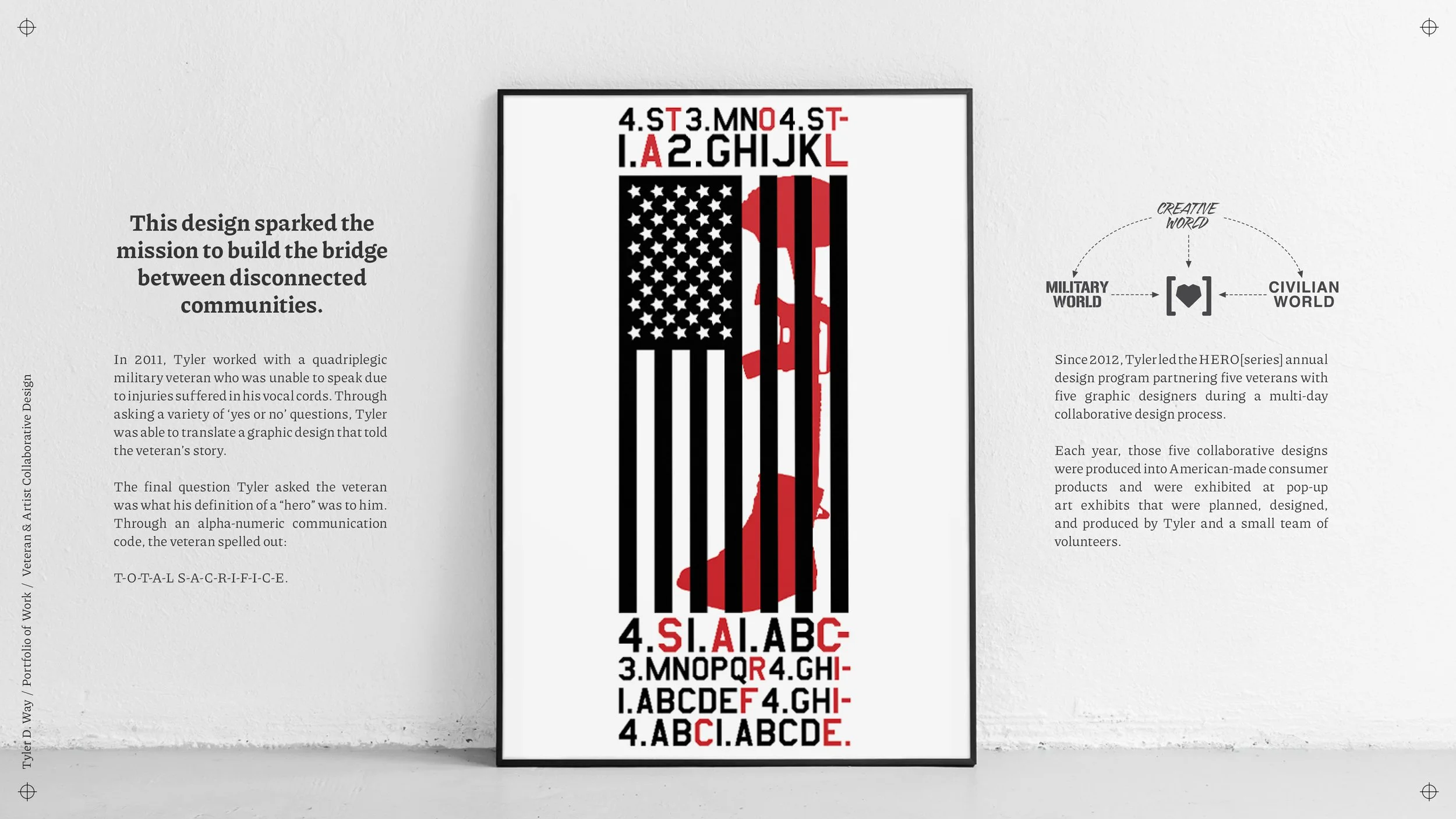 This design process is one example of the 60+ collaborative projects Tyler has planned, executed & facilitated as multi-day workshops between designers & veterans with photographers, videographers & other partners.