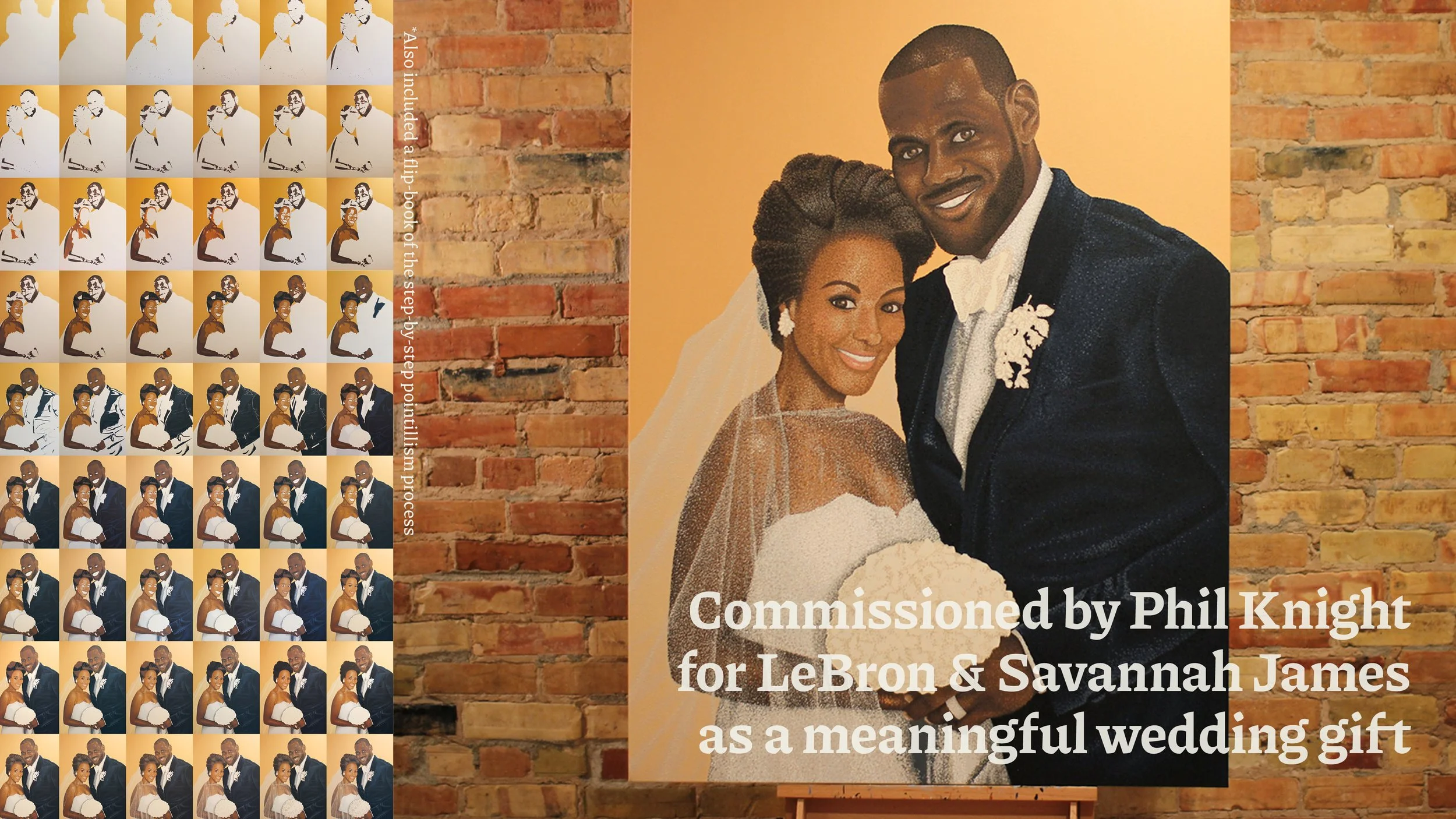 Tyler was commissioned by Nike founder, Phil Knight, to paint the top-secret wedding portrait for LeBron and Savannah James utilizing his unique pointillism technique.