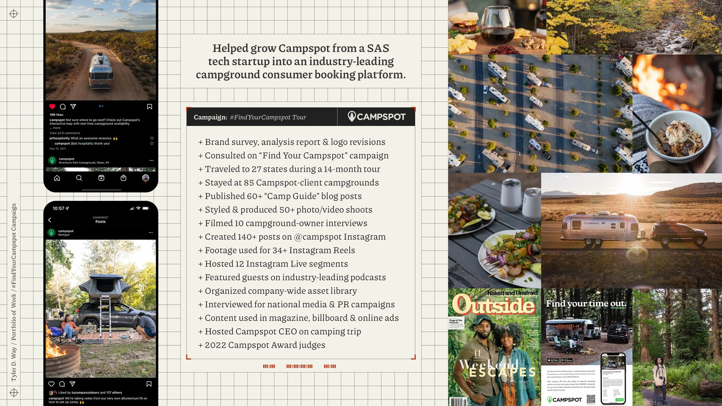 Tyler and his wife/partner Kendra were contracted by Campspot, a tech startup designed to help bring the campground industry online through its booking software. In addition to doing a brand consultation, #FindYourCampspot campaign creation, and a variety of PR stories and marketing partnerships, they lived/worked on the road driving 28,000+ miles, staying at 85 campgrounds in 27 states.