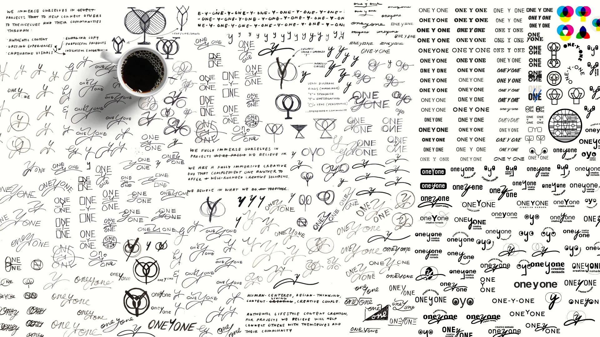 Tyler collaborated with partner Kendra Clapp Olguin and brand design expert Seth Herman to create the oneyone identity system. Representing the convergence of two individuals, backgrounds, cultures & skillsets, the “y” means “and” in Spanish and connects each “one” together. In addition to the wordmark, an “eye-con” was established for more playful uses.