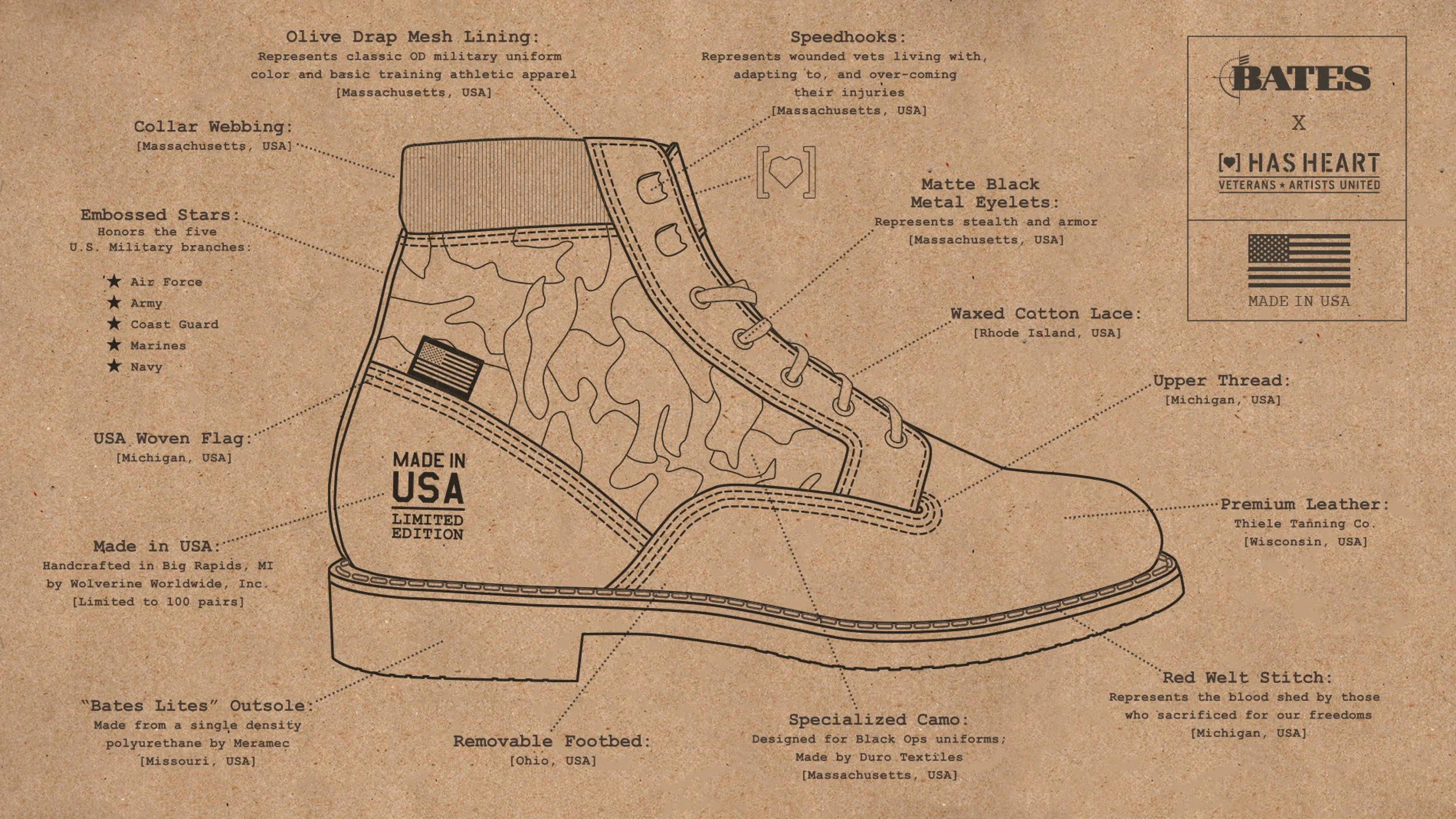 Tyler pitched a collaborative [HAS HEART] boot project to Bates Footwear, the leading military footwear supplier. The concept was to combine a military dress oxford with a tactical boot in a limited run made in Michigan.